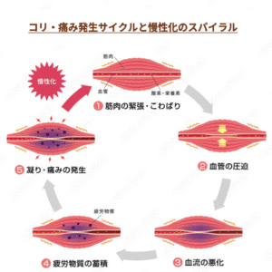 血液は酸素と熱と栄養を体に運び、老廃物や二酸化炭素を回収する働きがあります。血のめぐりが悪いと老廃物が排出されずにとどまり、痛みの物質となり肩こりや腰痛など症状が現れます。